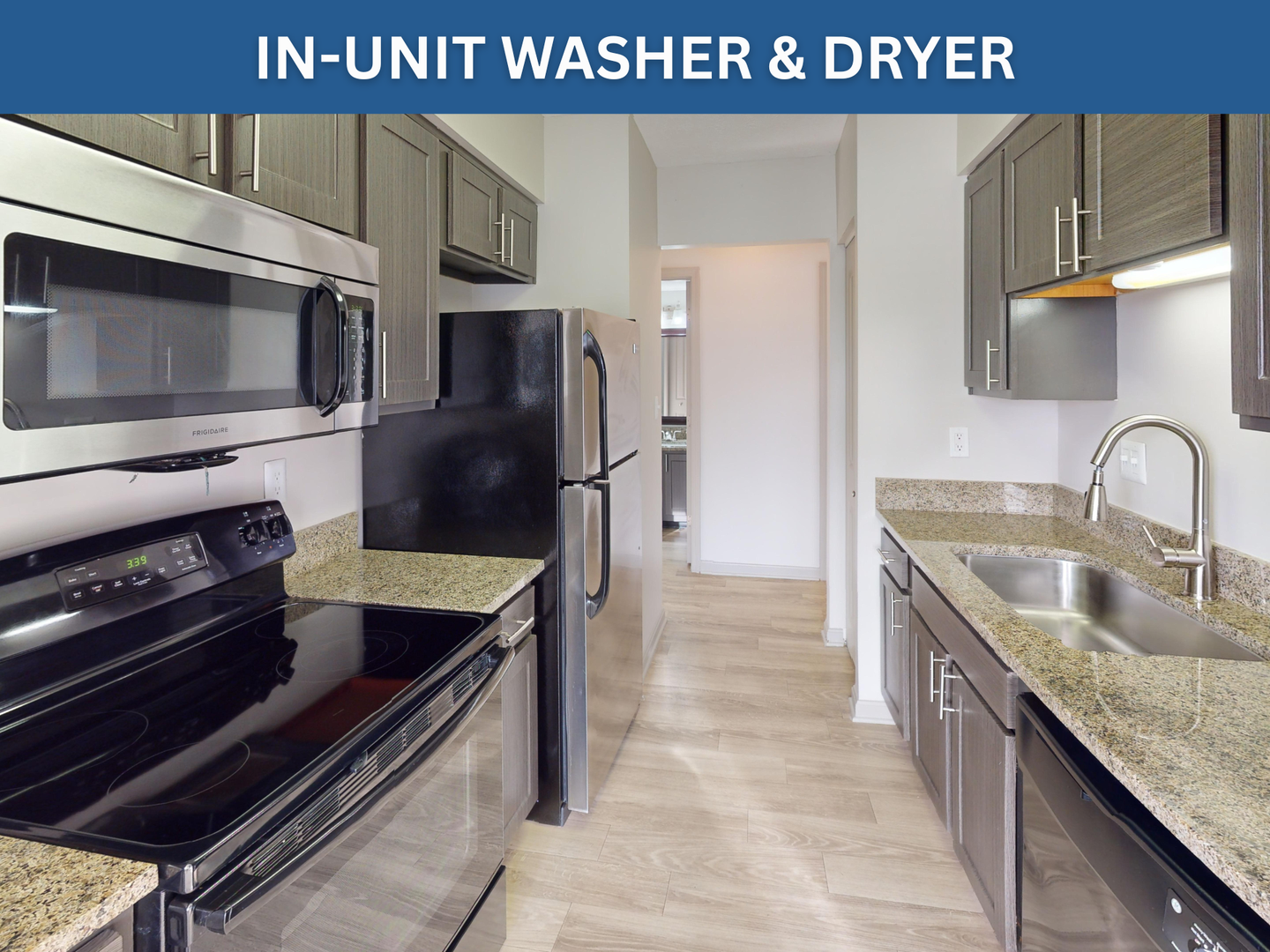 These 1-bedroom, 1-bathroom Heritage apartments feature 718 sq. ft. of stylishly renovated living space. Enjoy modern finishes throughout, including stainless steel appliances, granite countertops, and an in-unit washer and dryer. Flooring finishes vary by apartment and may include vinyl or carpet.